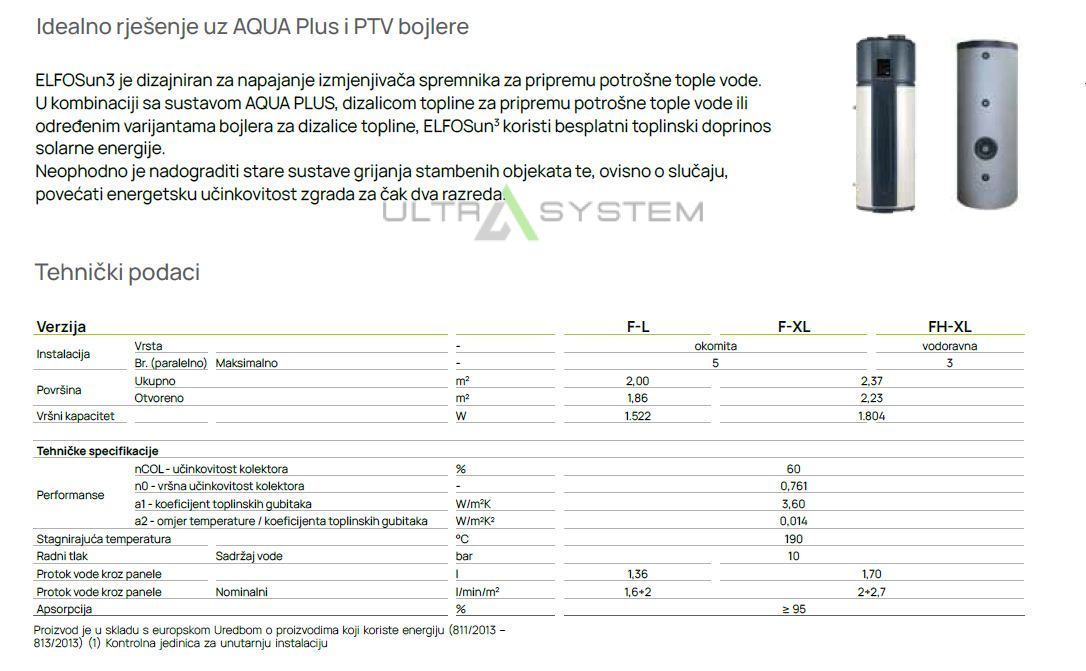 Performanse: η₀ ≈ 0,716; gubitak α₁ = 3,87 W/m²K, α₂ = 0,0069 W/m²K²; stagna temperatura do 192 °C